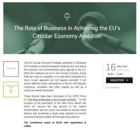 The EU Circular Economy Package published in December 2015 marked a milestone towards breaking silos and linking the economic and environmental policy agenda in the EU. While the initiatives set out in the Circular Economy Action Plan are close to completion, it is clear that a transition to a more circular approach will not happen overnight. It will require effective policy interventions in the EU and beyond, continuous innovation and other support as well as a conducive market framework. These themes have been discussed in the CEPS Force on ‘The Role of Business in the Circular Economy’. On the occasion of the publication of the Task Force Report this event will discuss the key barriers to the market transformation and the policy mix needed to remove these barriers and accelerate a large scale adoption of circular economy business models, technologies and practices.