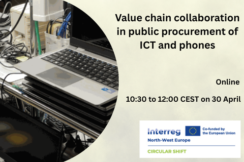 Value chain collaboration in public procurement of ICT and phones – online, 10:30 to 12:00 CEST on 30 April. Co-funded by the European Union, Interreg North-west Europe, Circular Shift